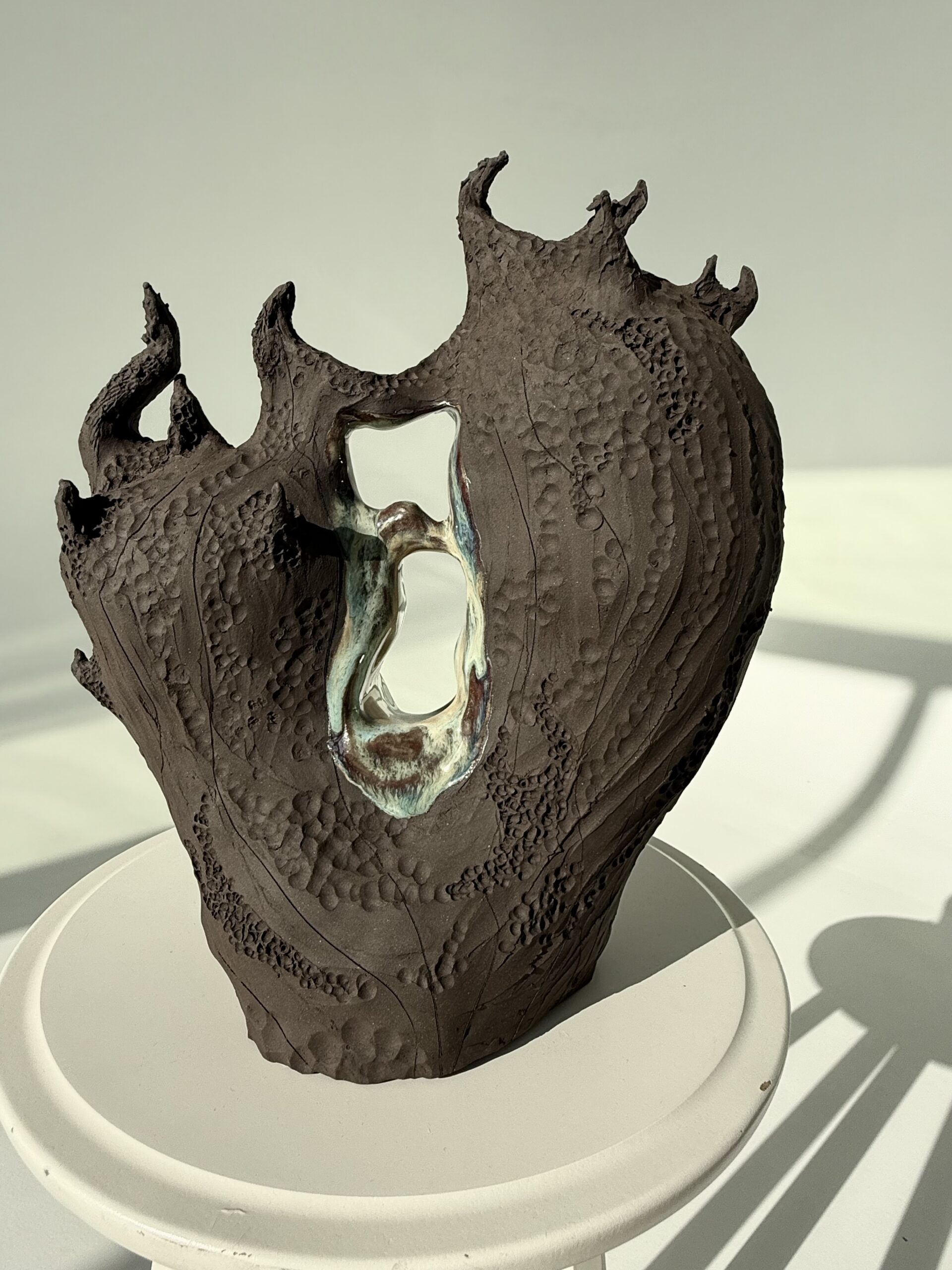 Dynamiczna, czarna, magmowa forma z wnętrzem błękitnym jak ocean. Ta rzeźba jest jak