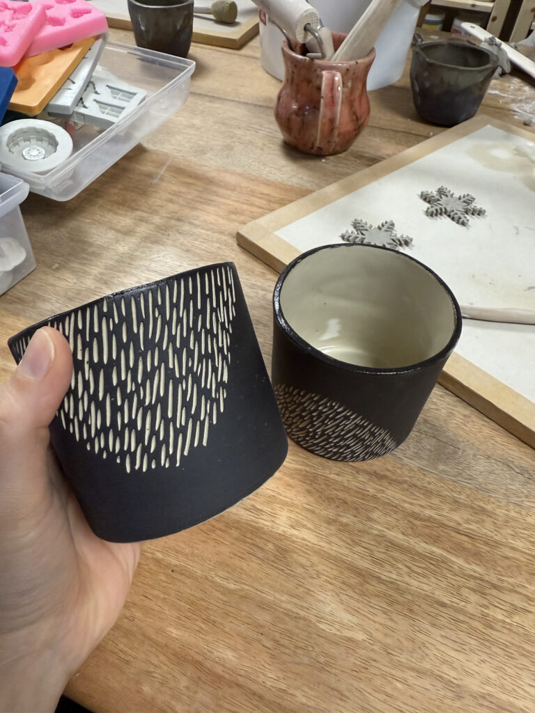 3.   Kontrast: Ostre narzędzie zdejmuje wierzchnią warstwę, odsłaniając jasną glinę pod spodem. Tak powstają precyzyjne linie, graficzne motywy i faktury, które chce się dotykać.